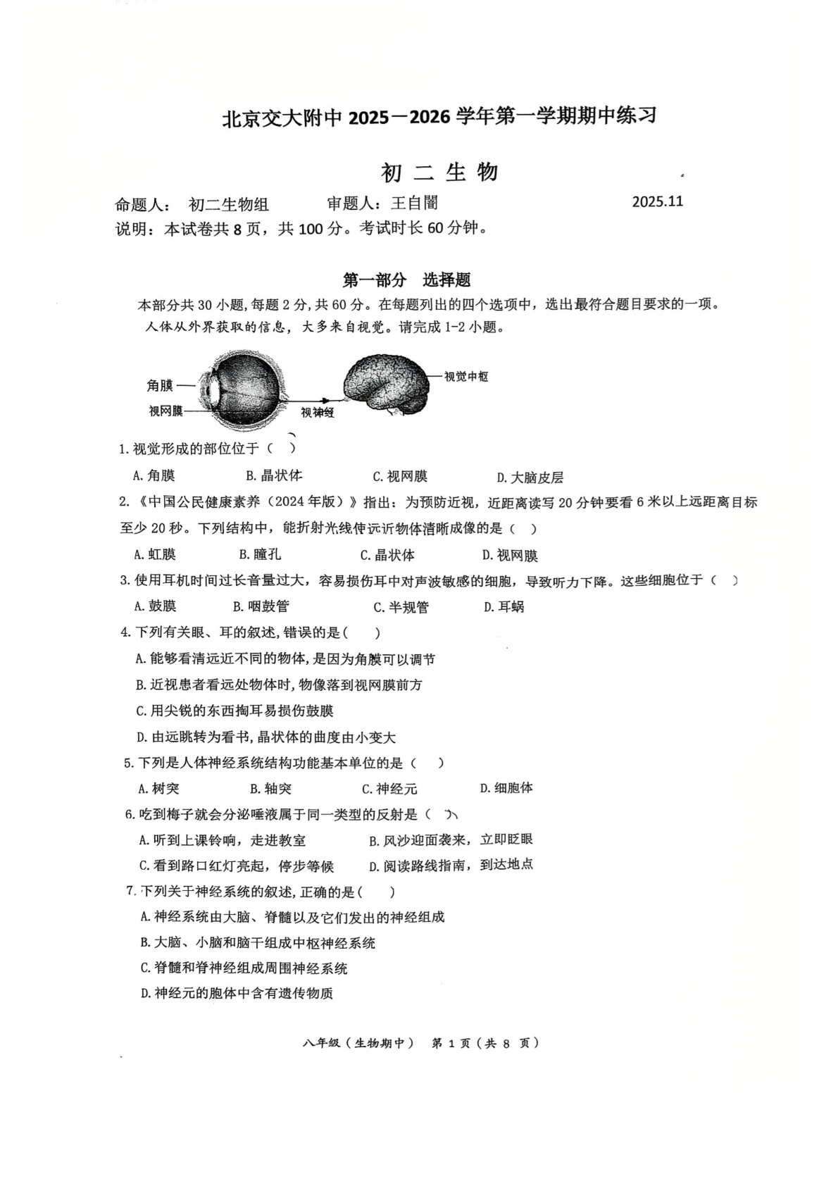北京各区2025-2026学年初二年级期中考试陆续开考。为了方便同学们练习,北京高考在线团队特意整理了2025-2026学年北京交大附中初二上学期期中生物试题及答案,详情如下:
