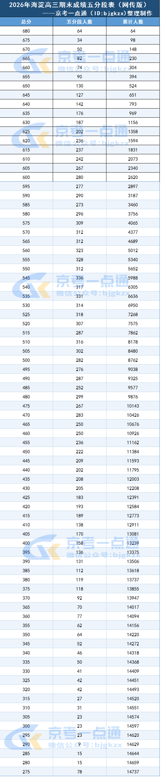近日,北京市东城、西城、海淀、朝阳等区的高三年级期末考试成绩已陆续揭晓,备受关注的 “分数线、区排名及一分一段表” 也相继出炉。北京高考在线团队特意搜集整理了2025-2026学年北京海淀区高三期末五分一段表,供考生参考!
