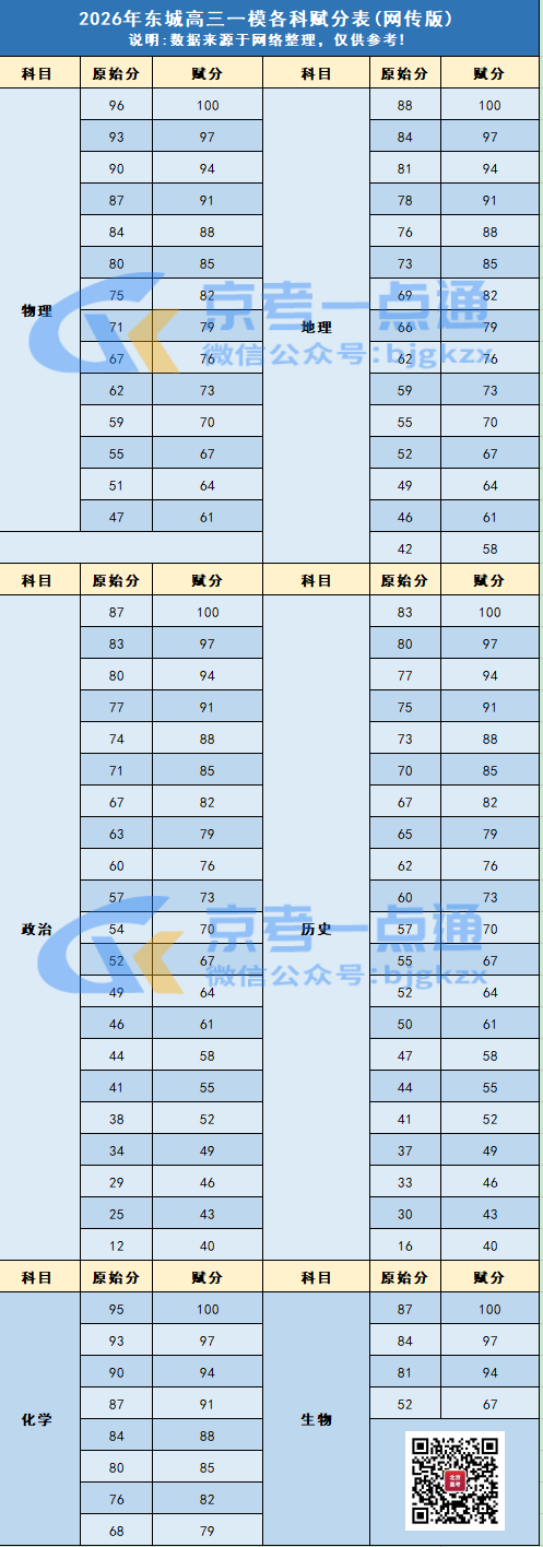 目前,北京各区高三一模考试已结束,各区分数线、区排名、一分一段表陆续公布,北京高考在线整理了2026北京东城区高三一模赋分表,详情如下: