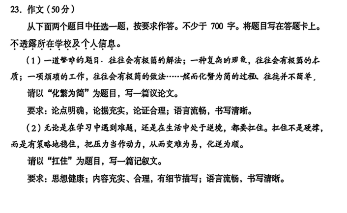 23.作文(50分)从下面两个题目中任选一题,按要求作答。不砂少于700字。将题目写在答题卡上。不透露所在学校及个人信息。