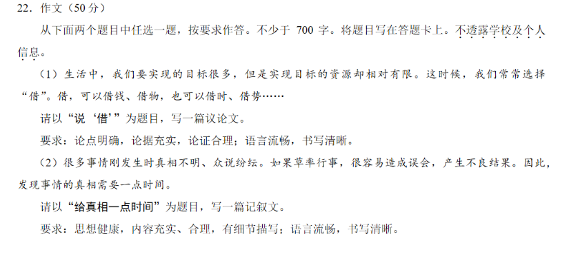 22,作文(50分)从下面两个题目中任选一题,按要求作答。不少于700字。将题目写在答题卡上。不透露学校及个人信息。