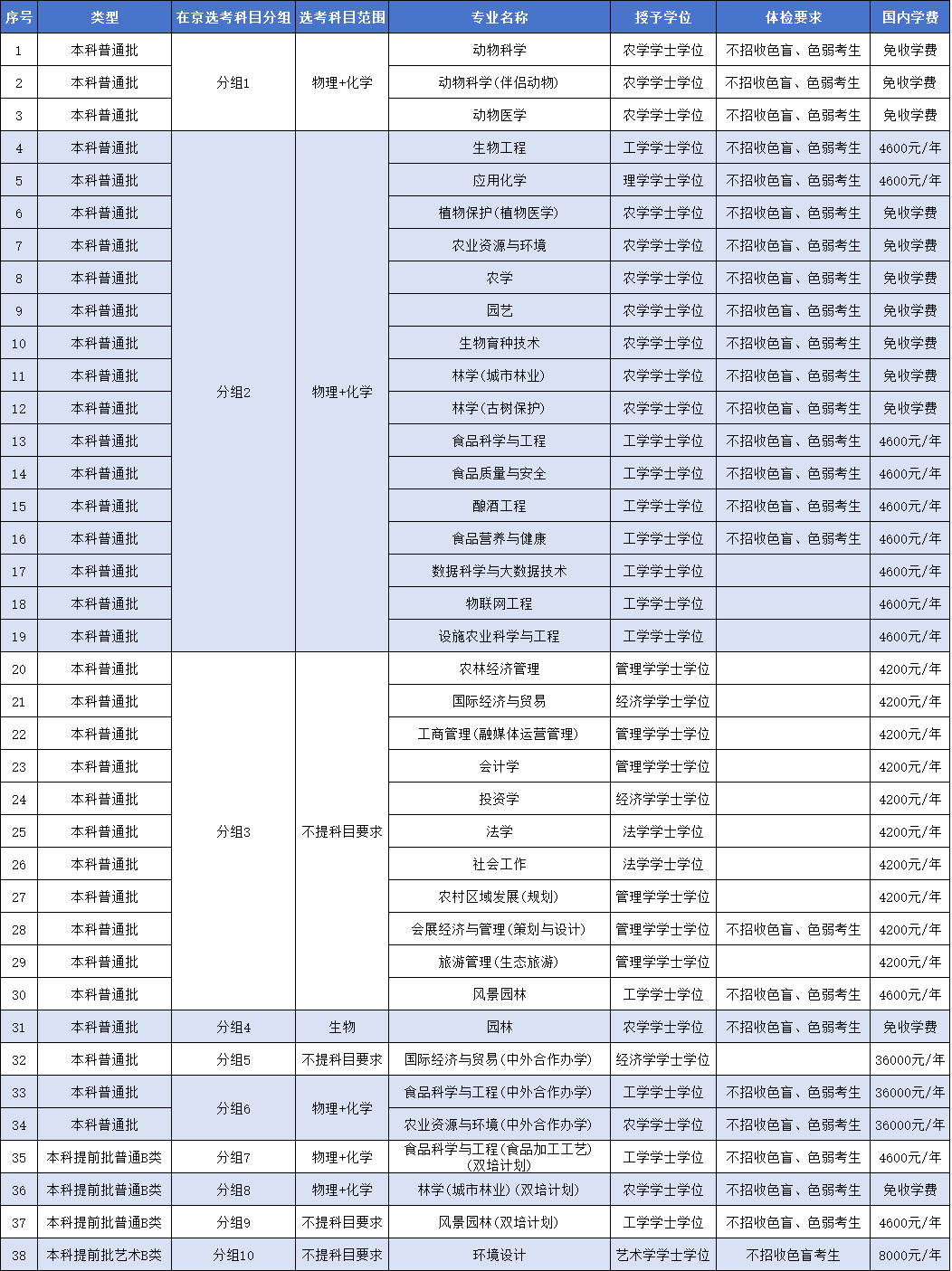 考生的体检按照教育部、卫生部《普通高等学校体检工作指导意见》及有关补充规定执行。色盲色弱考生限报我校生物工程、应用化学、植物保护、农业资源与环境、农学、园艺、生物育种技术、动物科学、动物医学、园林、风景园林、林学、食品科学与工程、食品质量与安全、酿酒工程、食品营养与健康、会展经济与管理等专业、食品科学与工程(中外合作办学)、农业资源与环境(中外合作办学)。色盲考生限报我校环境设计专业。