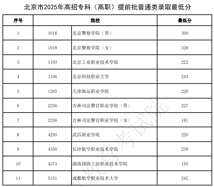 2025年北京高考专科(高职)提前批普通类录取投档线