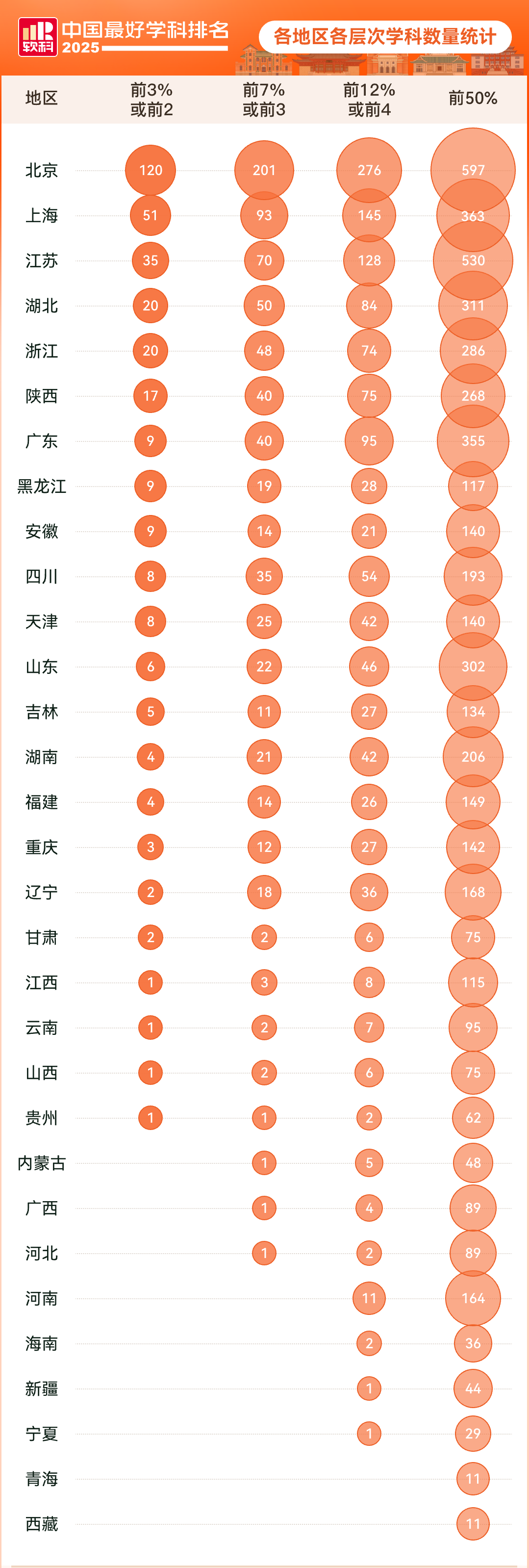 从各省级行政区的上榜学科数量分布看,北京占据绝对优势,各层次的上榜学科数量都高居全国第一。上海的前3%的顶尖学科数和前7%、前12%的一流学科数均位列全国第二,高峰高原学科建设成效显著。江苏的前50%学科数紧随北京,上榜数位列全国第二,学科整体实力难以撼动。此外,湖北、浙江、陕西等省的中国顶尖学科数量处于国内前列,广东、湖北、山东、浙江、陕西等省的上榜学科总数较多。