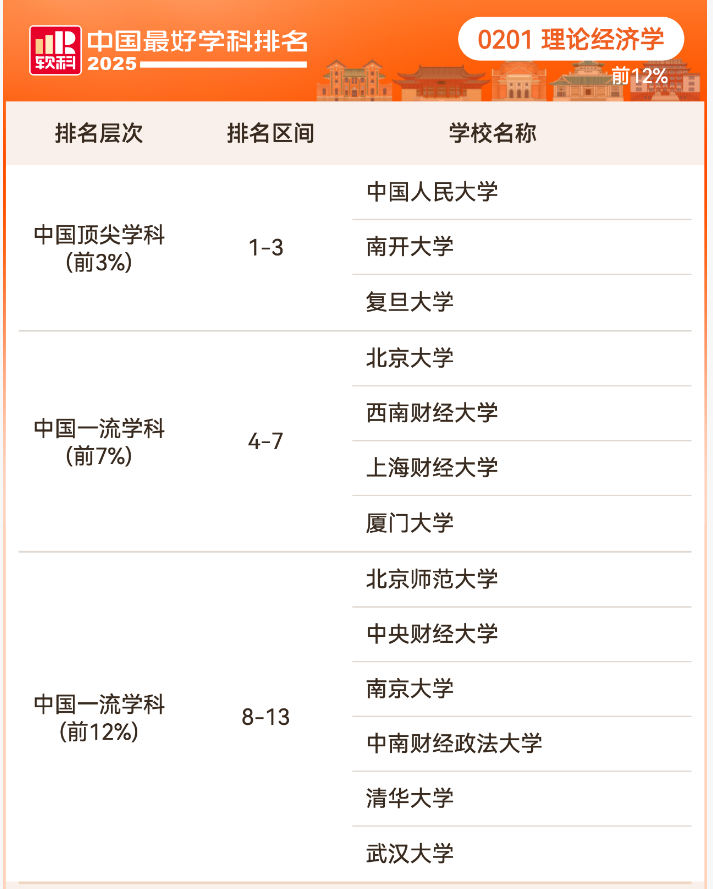 目前2025软科中国最好学科排名公布,排名榜单包括98个一级学科和5个专业学位类别,本文整理了经济学排名前12%的高校,供考生参考。(2025年10月15日)高等教育评价专业机构软科今日正式发布“2025软科中国最好学科排名”。