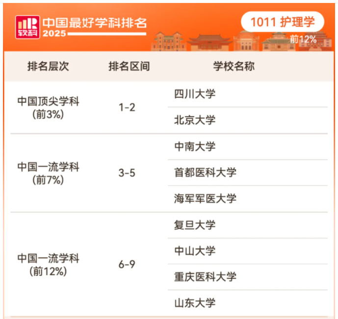 护理学排名前12%的高校: