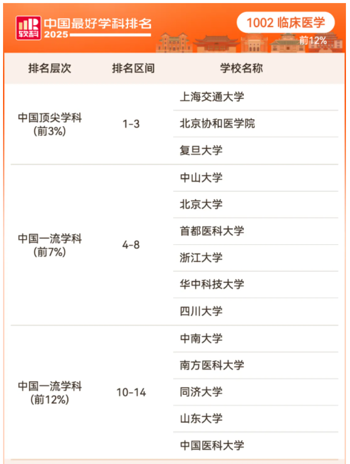 目前2025软科中国最好学科排名公布,排名榜单包括98个一级学科和5个专业学位类别,本文整理了医学排名前12%的高校,供考生参考。