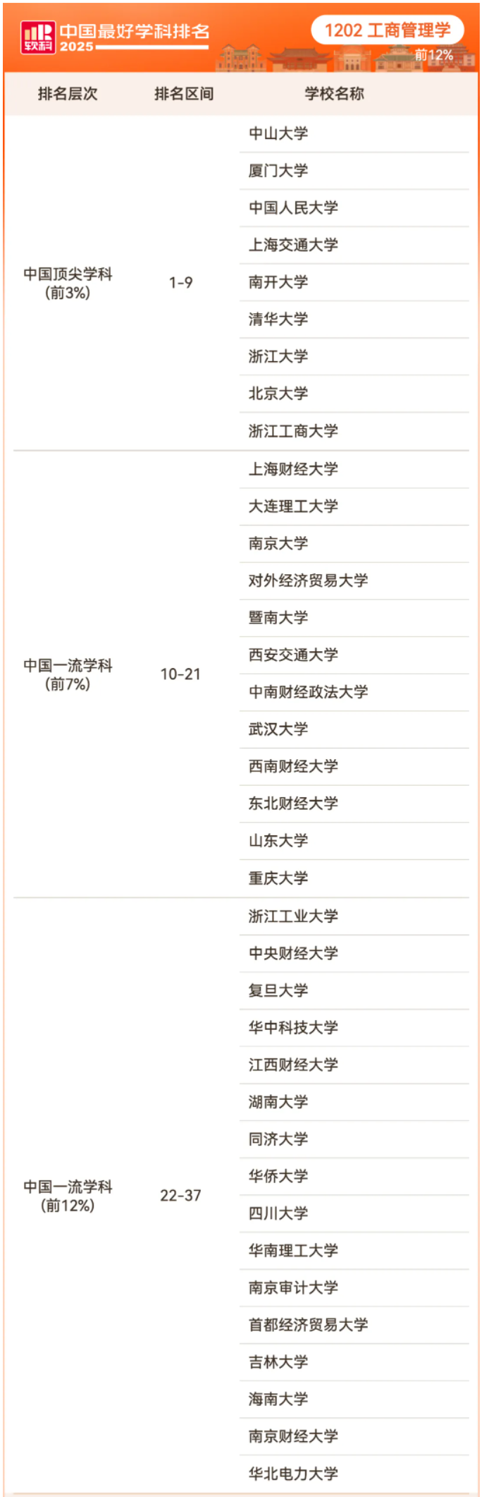 目前2025软科中国最好学科排名公布,排名榜单包括98个一级学科和5个专业学位类别,本文整理了管理学排名前12%的高校,供考生参考。