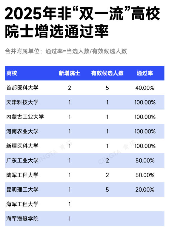 而在自身特色领域精准布局与扎实积累的非“双一流”高校,往往在院士增选通过率上表现优异。从有效候选人到最终增选,天津科技大学、内蒙古工业大学、河南农业大学、新疆医科大学都做到了100%成功增选,广东工业大学、陆军工程大学则在2位有效候选人中成功当选1位院士,通过率为50%。
