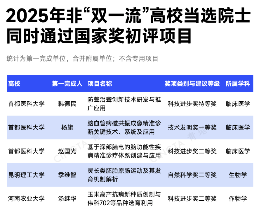今年尤为特殊的是,院士增选与国家奖评审同步推进。此前,2025年国家奖初评结果已揭晓,21所非“双一流”高校表现亮眼,共有26项成果入选,其中首都医科大学、昆明理工大学、河南农业大学这3所成功增选院士的高校,同时通过国家奖初评。