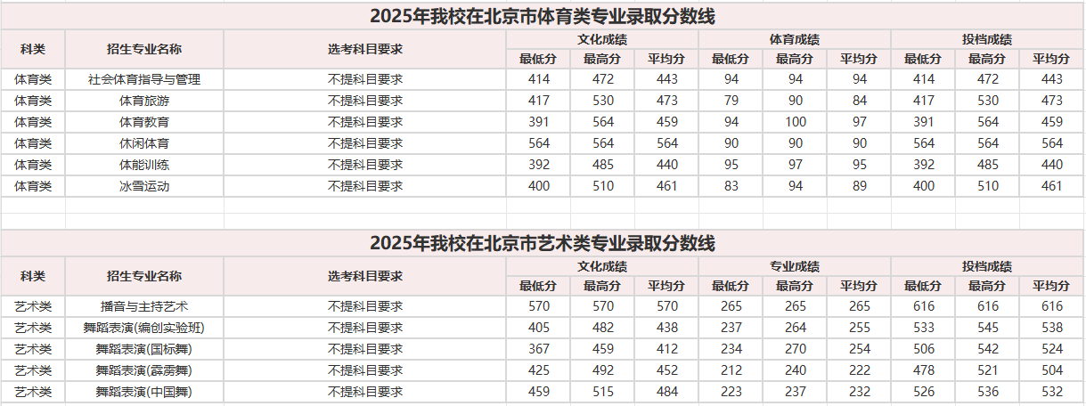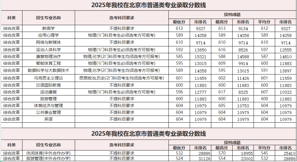 2025北京体育大学在京专业录取分数线