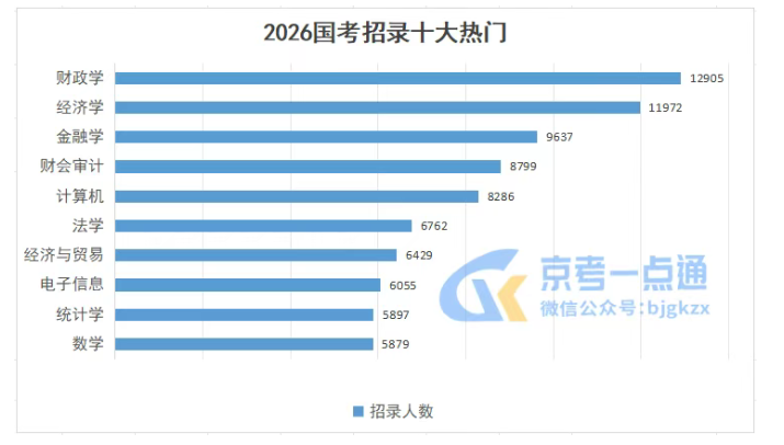 据中央机关及其直属机构2026年度考试录用公务员招考简章内容分析,几乎所有职位都有专业要求,其中,财政学类以12905的可报考岗位总人数位居热门专业榜首,经济学类、金融学类紧随其后。