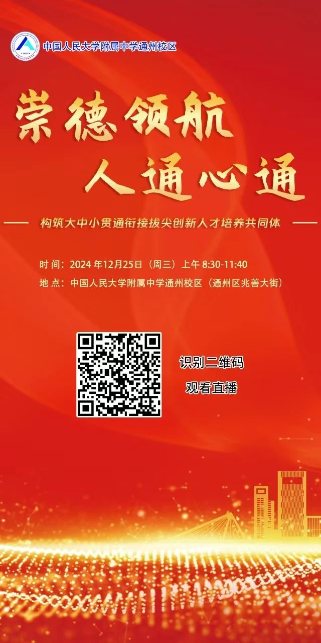 为贯彻党的二十大精神,推进拔尖创新人才培养,我校拟举办中国人民大学附属中学通州校区青少年创新人才培养基地启动仪式暨崇德、博学、创新、求实和心通等五大贯通书院创立大会,主题为“崇德领航 人通心通——构筑大中小贯通衔接拔尖创新人才培养共同体”。敬请识别以下二维码观看现场直播!