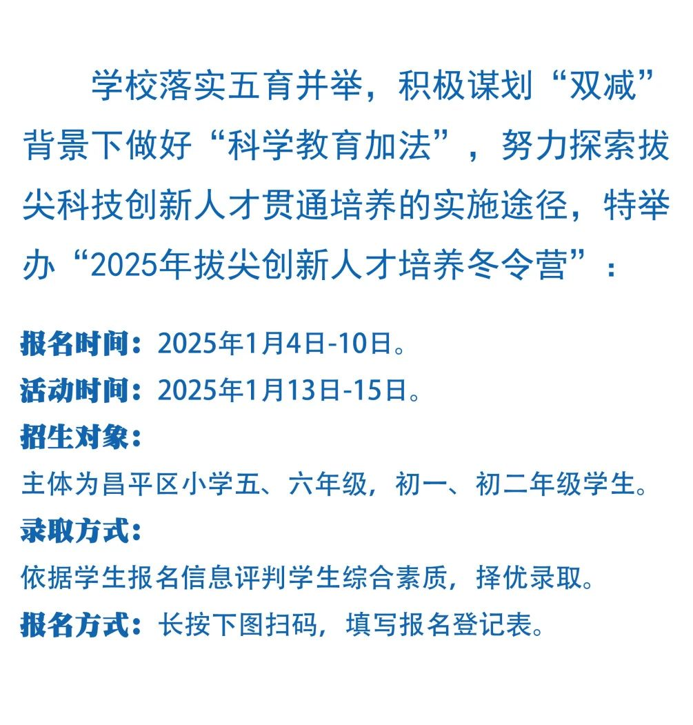 昌平二中拔尖创新人才培养冬令营报名开始了,报名时间截止到1月10日。