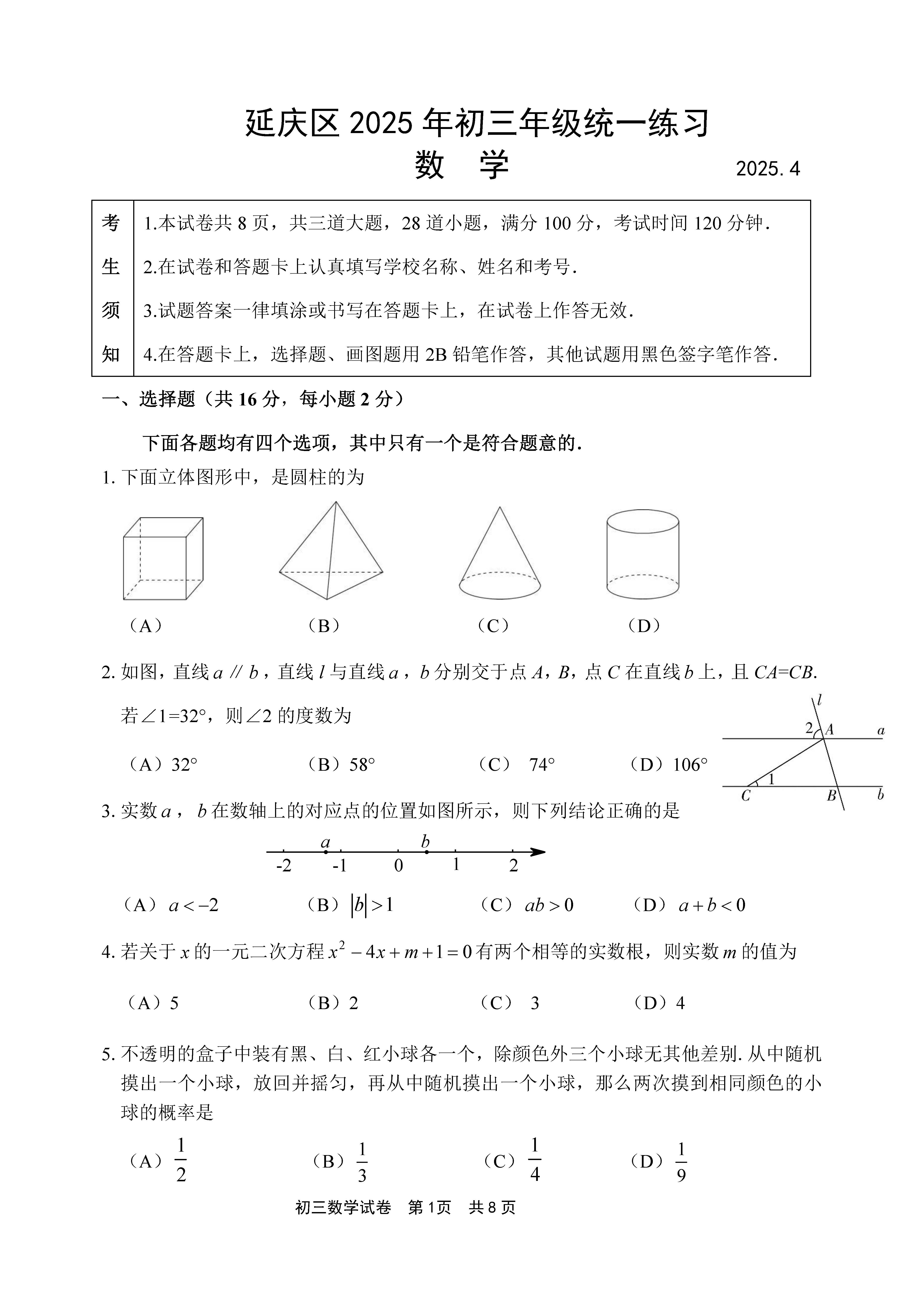 目前,北京延庆区初三一模考试已进行,北京高考在线整理了2025北京延庆区初三一模数学试题及答案,同学们可以根据详情如下: