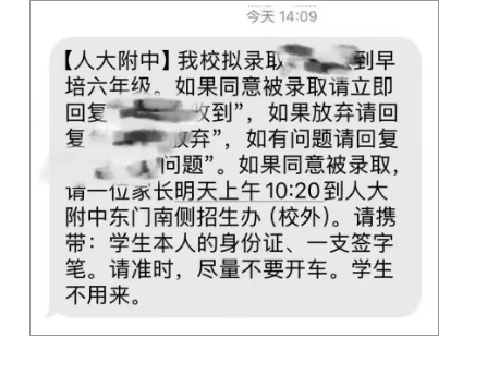 请收到短信的家长于今天(7月29日)上午10:20到人大附中东门南侧招生办 (校外)。
