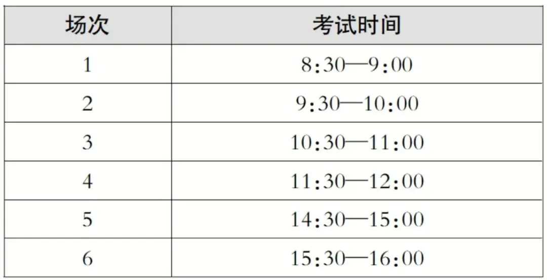 英语听说机考每天最多安排6场,每场考试时间约30分钟。考试具体安排如下: