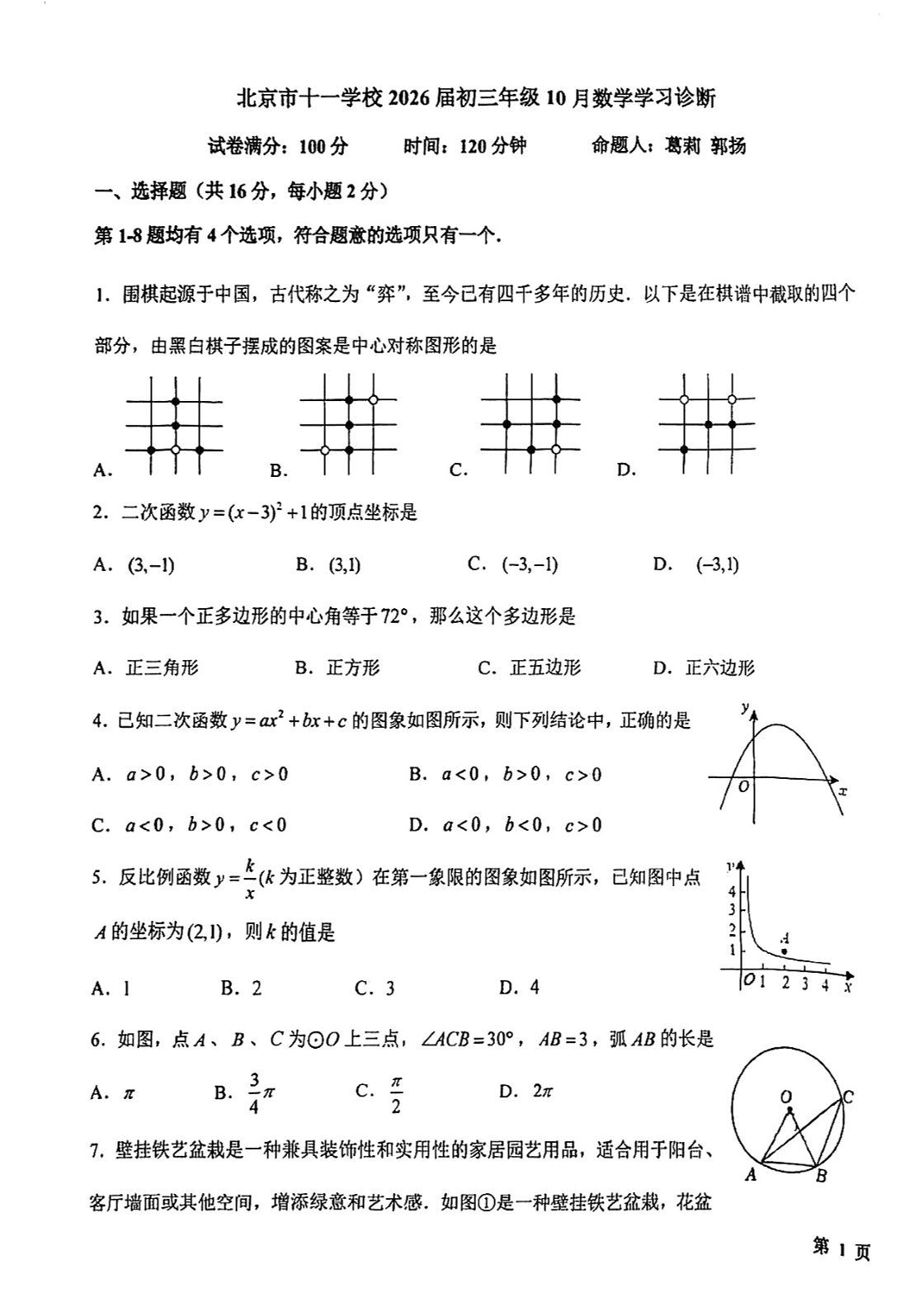 北京各高校开学后每月会定期举行月考考试,为了方便同学们查找相关试题答案,北京高考在线团队特意整理了2025-2026学年北京十一学校初三10月月考数学试题及答案,详情如下: