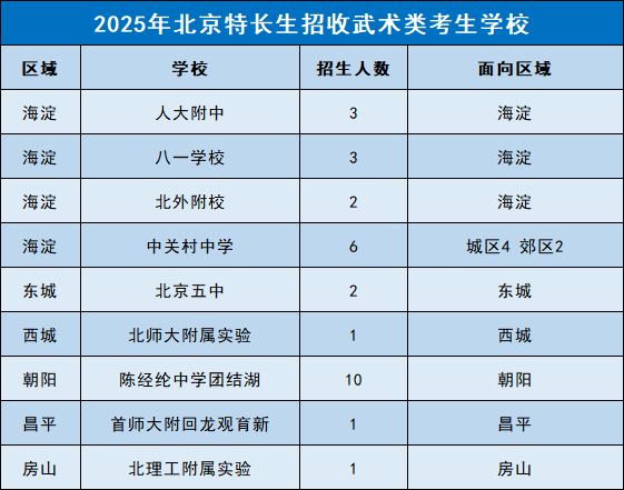 特长生作为中考升学途径之一,备受家长关注。哪些学校招收武术特长生?招多少人?北京高考在线给大家整理了相关内容,一起来看!