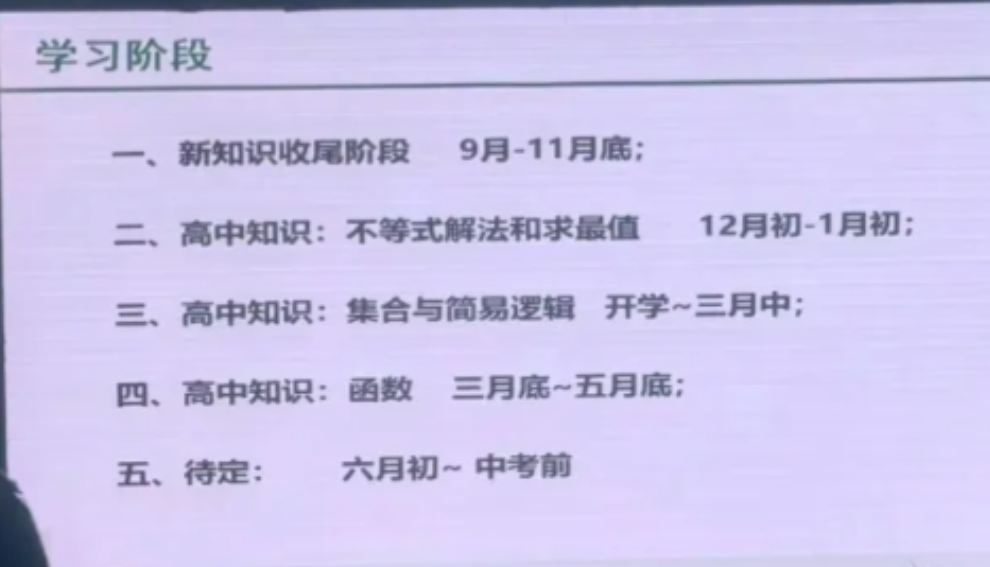 ②12月初到1月初就要开始学习高中知识。据网友分享,1+3的数学科目在11月底前学完初中剩余课程,12月就开始学习高中内容(不等式、集合与函数)直至明年5月底,预计明年6月初开始复习,迎接中考。