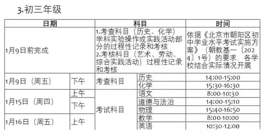 2025-2026学年北京各区初一、初二、初三年级期末考试将于1月上旬进行,北京高考在线团队收集到了2025-2026学年北京朝阳区初三期末考试具体时间安排,详情如下:
