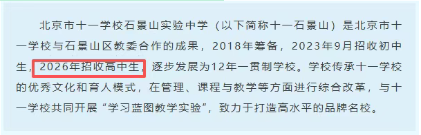 十一学校石景山实验中学2026年开始招收高中生。