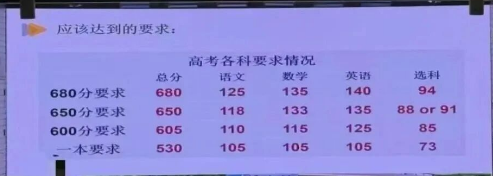 其中最让家长震撼的,是一张高考各科分数要求情况表。它将不同总分目标,精准拆解到每一门科目,让孩子的努力方向一目了然。这种量化管理如今已是多所重点中学的常规操作,核心价值就在于给学生一个清晰、可落地的提分路径:比如当前英语 130 分,距离目标还差 10 分,就能明确知道该在哪些模块重点发力。