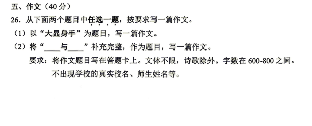 要求:将作文题目写在答题卡上。文体不限,诗歌除外。字數在600-800之间。不出现学校的真实校名、师生姓名等。