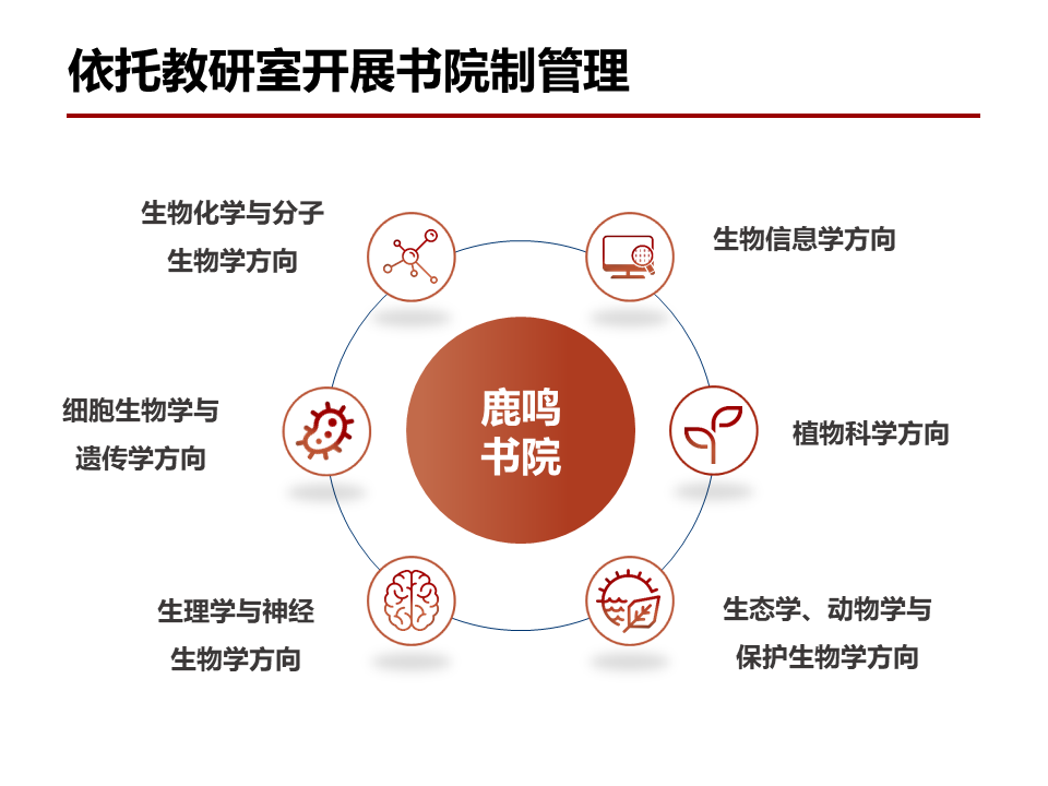 北京大学生命科学学院根据教师科研方向划分为6个教研室,“鹿鸣书院”的运行和管理主要依托这6个教研室。2023年,我院与北京协和医学院合作新开办医药科学班,致力于培养思想品德高尚,具备社会担当、国际视野、创新精神和实践能力的多学科背景的复合型高层次卓越医学领军人才。