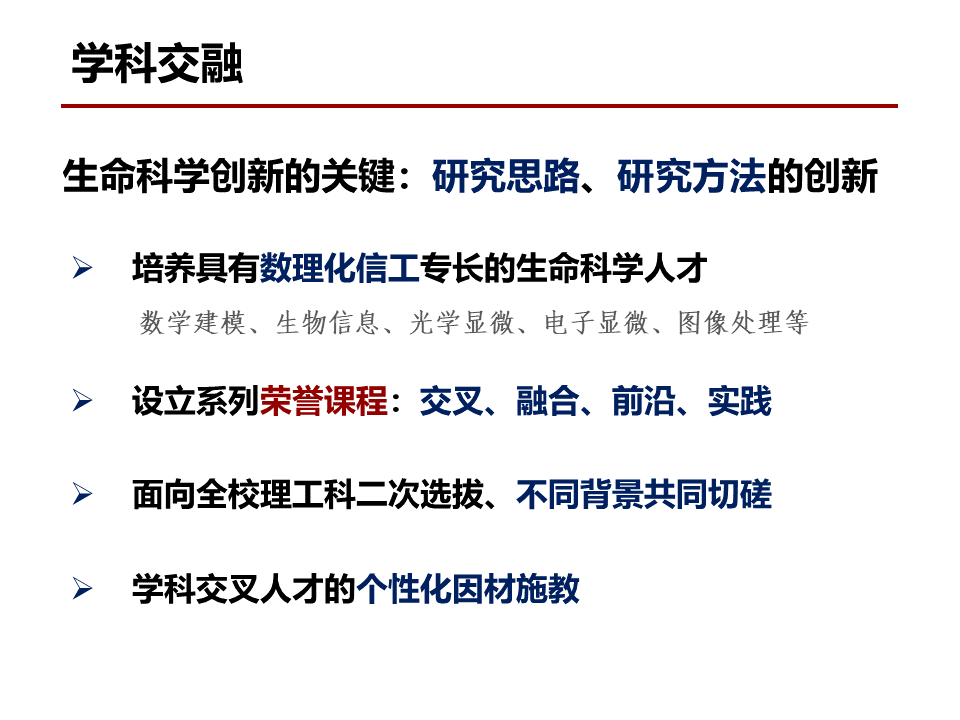 为训练学生在方法、思路上的创造性和创新能力,我们开设生物数学建模、生物物理学、化学生物学、生物信息学、工程基础与实践等课程,加强数、理、化、信、工的理论和方法与生命科学问题的深度融合。