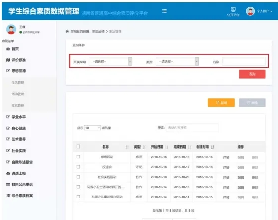 查询:选择所属学期下拉框,选择类别和活动名称等条件,点击【查询】按钮,查询出符合条件的数据记录。