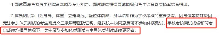 并且部分学校在考核面试成绩和高考总成绩均相同情况下,会优先录取参加体质测试考生且体质测试成绩更高者。好成绩有了,好身体也不能落下。