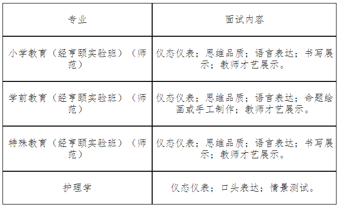 采用分专业面试的方式进行。面试主要考核考生专业素养、专业潜质,具体内容如下(在教师才艺展示环节中,考生除钢琴以外的所需用品需自备):
