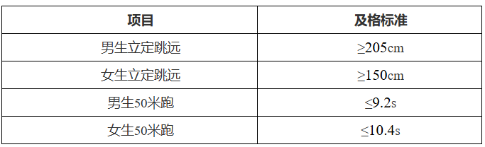 2️⃣体质测试:测试项目可自主选择立定跳远或50米跑,不受理缓考、补考申请。体质测试及格标准如下: