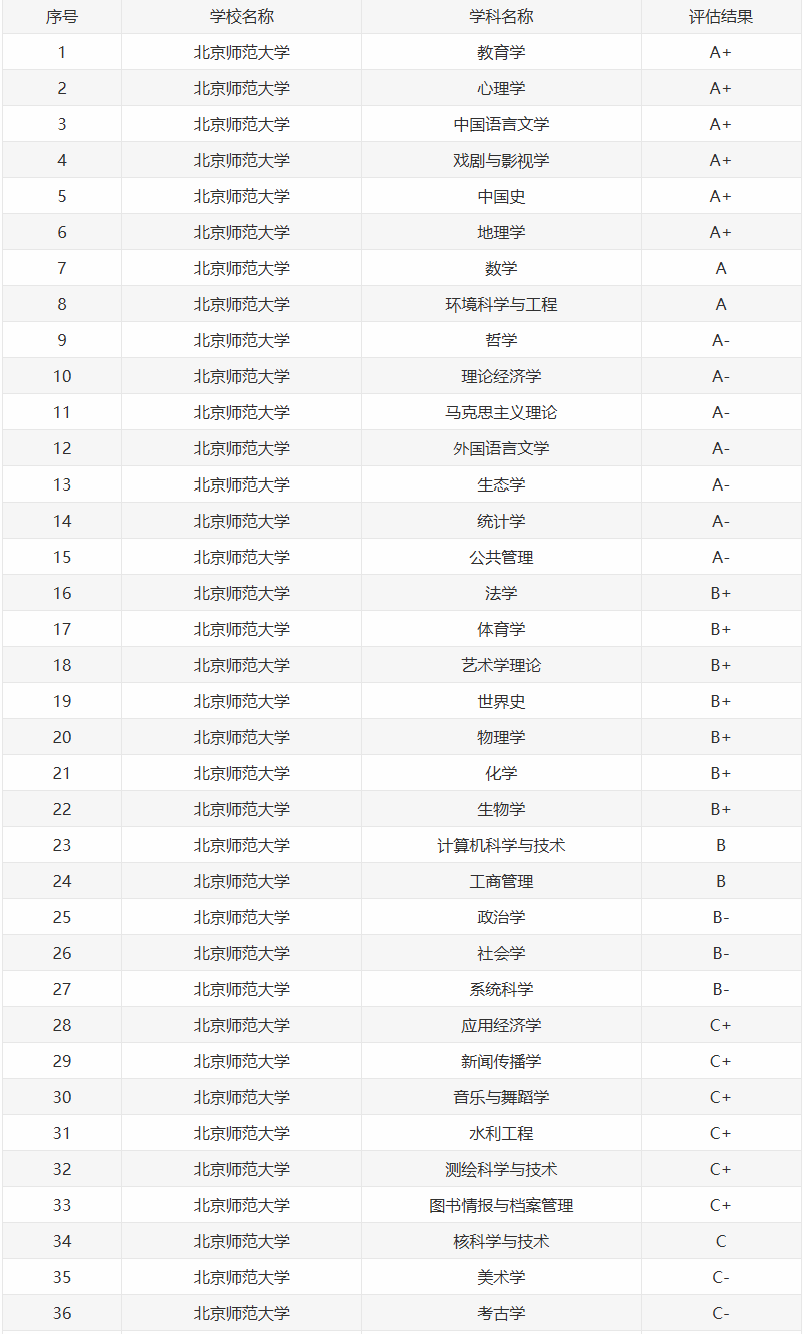 在第四轮学科评估中,北师大有6个A+专业,2个A专业,7个A-专业。以下是具体的学科评估结果。