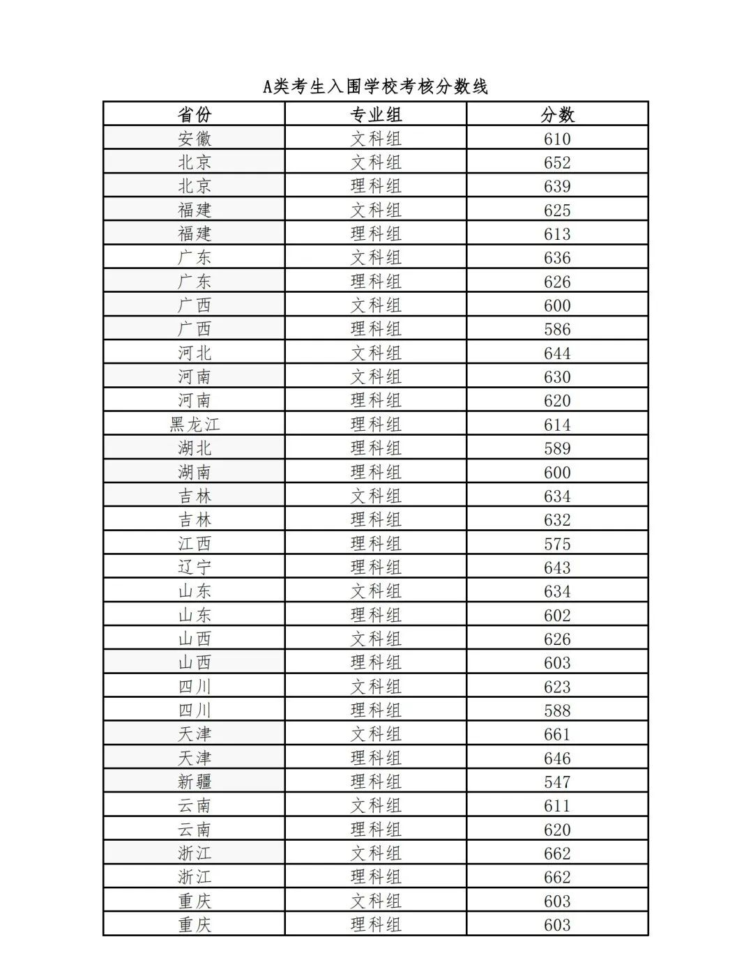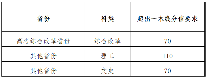 A类考生:学校依据高考成绩按分省分专业招生计划数的5倍确定入围名单,且高考成绩须达到所在省份同科类特招线/一本线上一定分值: