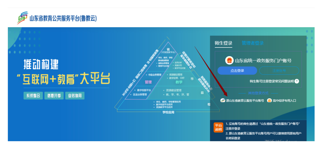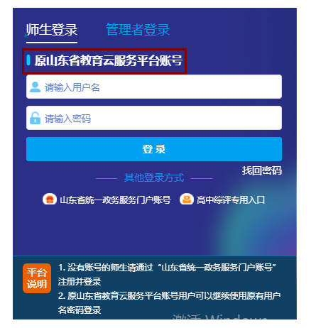 1.访问山东省教育公共服务平台登录网址www.sdei.edu.cn/home/html/shouye.html进入登录页面,点击“原山东省教育云服务平台账号”进行登录,登录后进入山东省教育公共服务平台。