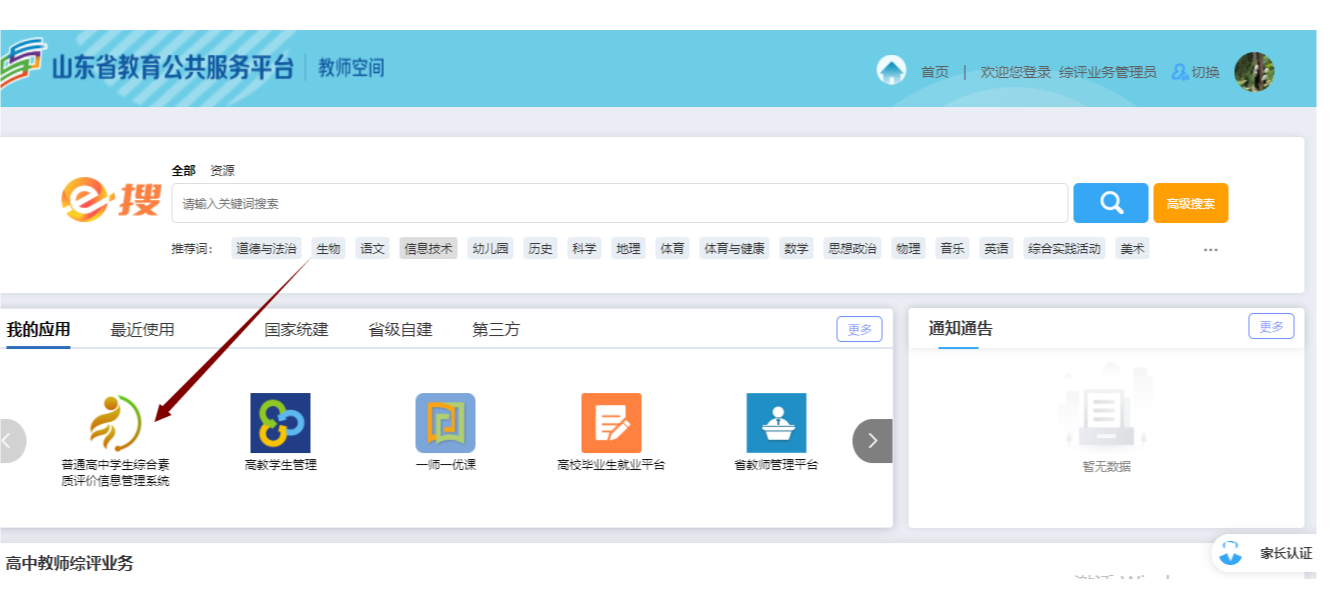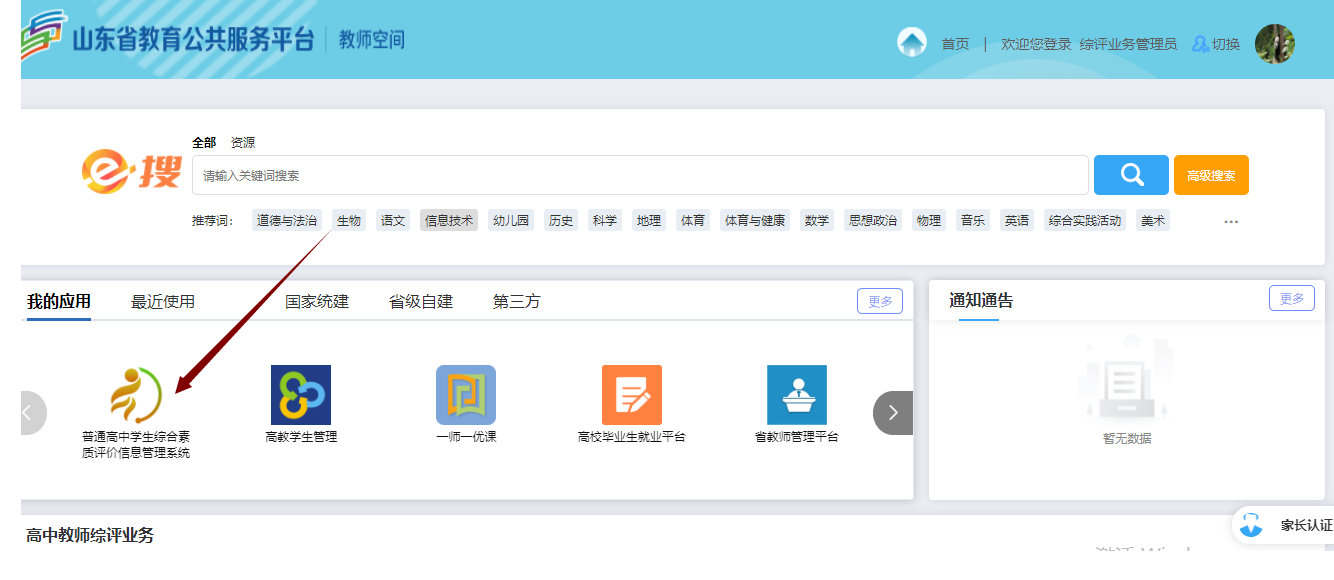 (1)登录山东省教育公共服务平台后,点击“我的应用--综评系统”进入。