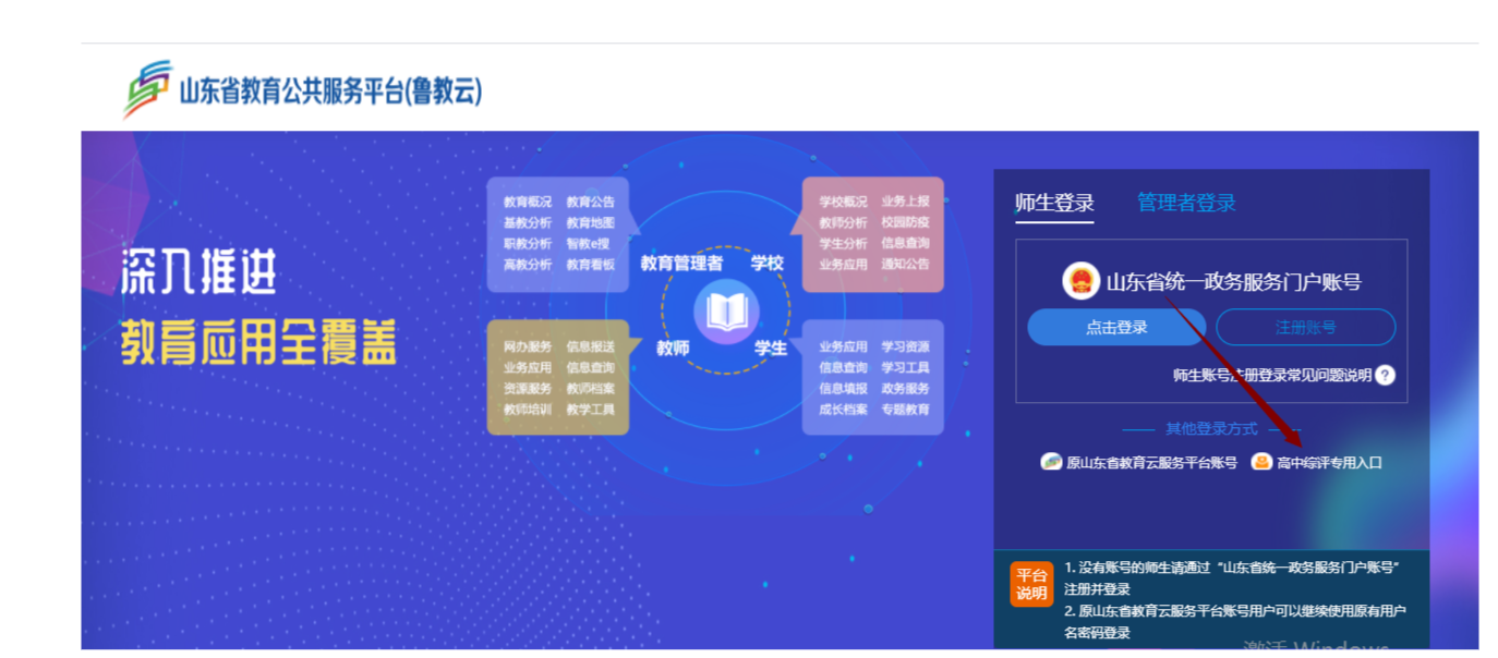 1.采用访问山东省教育公共服务平台登录网址方式www.sdei.edu.cn/home/html/shouye.html进入登录页面,点击“高中综评专用入口”进行登录。