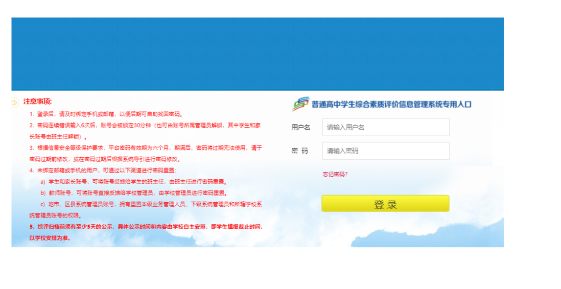 注意:综评系统专用入口不能使用在平台绑定的手机号或者邮箱登录,只能使用账号登录。