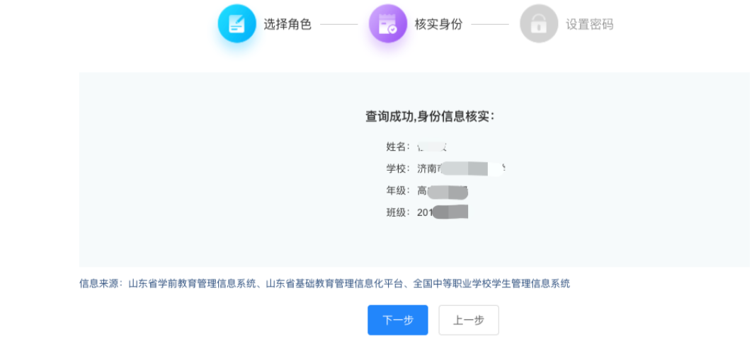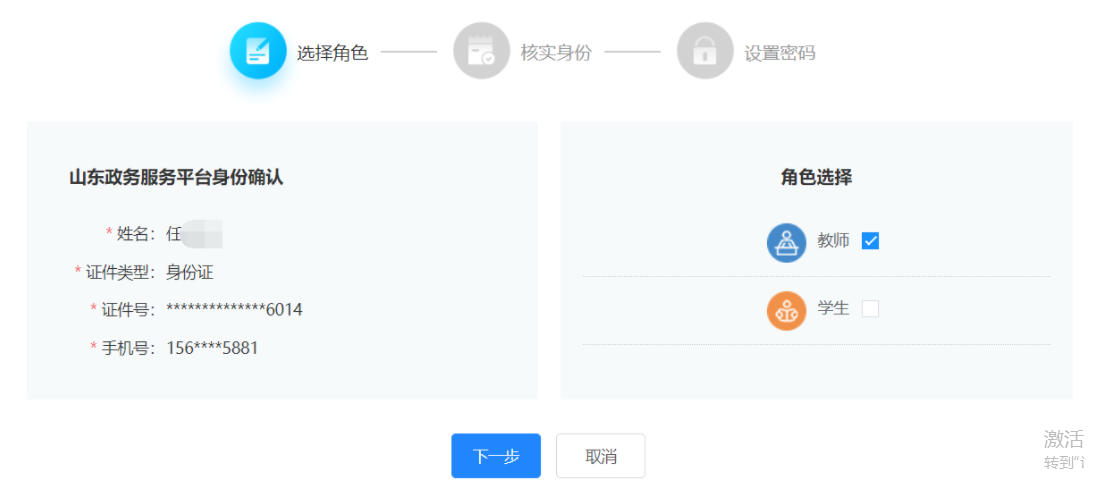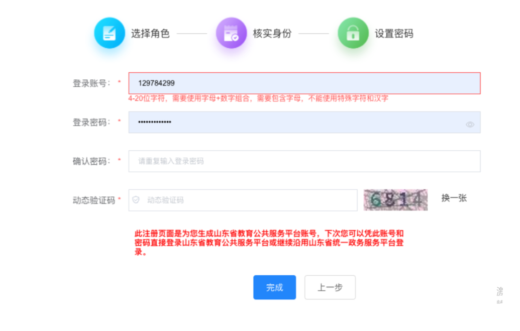 (4)设置密码,此步生成山东省教育公共服务平台账号,凭此账号和密码可通过山东省教育公共服务平台直接登录或继续沿用山东省统一政务服务门户认证登录。