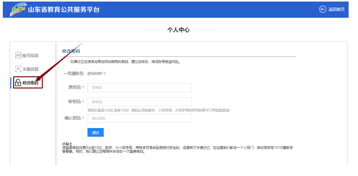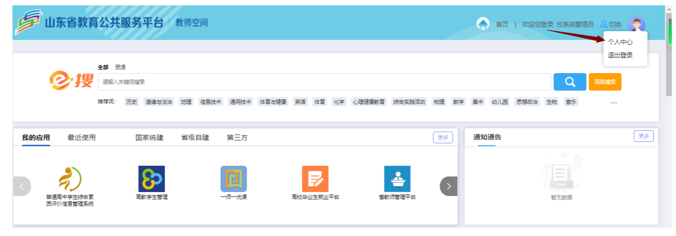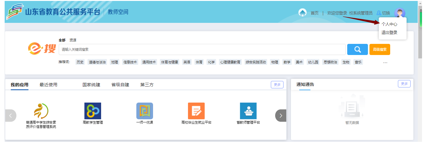 1.登录山东省教育公共服务平台后,点击右上角“头像--个人中心”