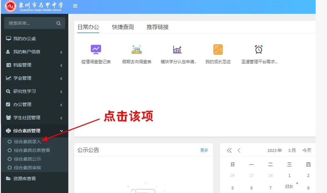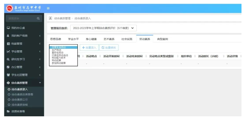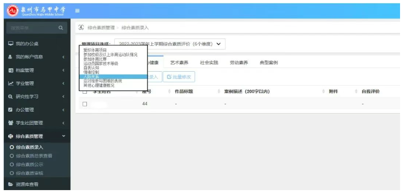 登录之后,点击“综合素质管理”--“综合素质录入”。