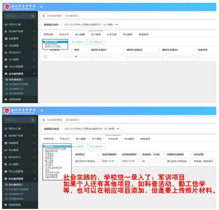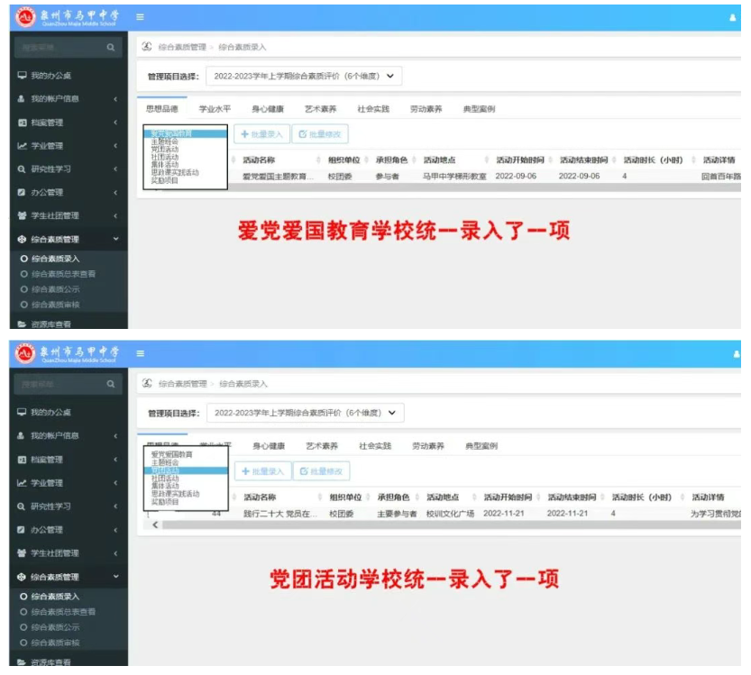 我们需要录入信息的平台有以下2个,下面就2个部分的录入项目做个简要说明:(以泉州市马甲中学为例)