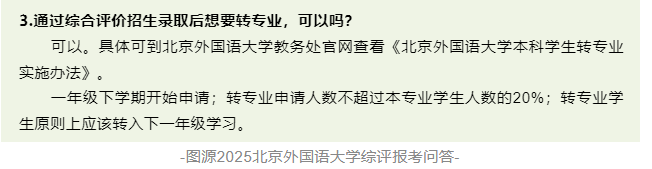 在北外官方发布的报考答疑中提到,综合评价可以转专业,但须符合转出院系的条件和接收院系的条件。具体可到北外教务处网页(https://jwc.bfsu.edu.cn/)查看《北京外国语大学本科学生转专业实施办法(试行)》。