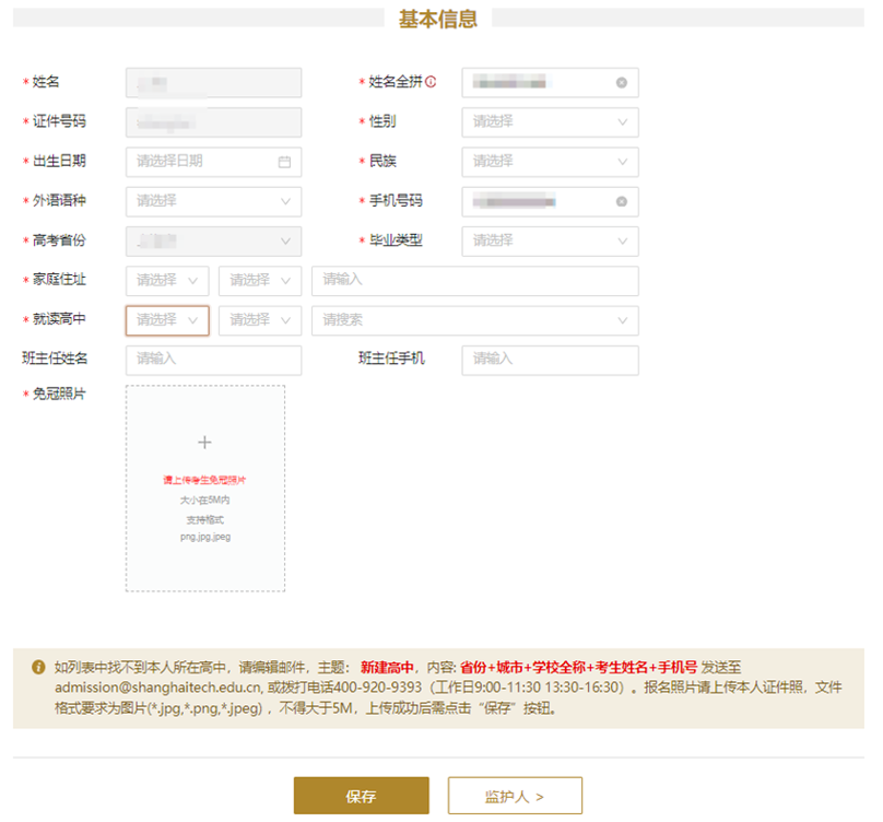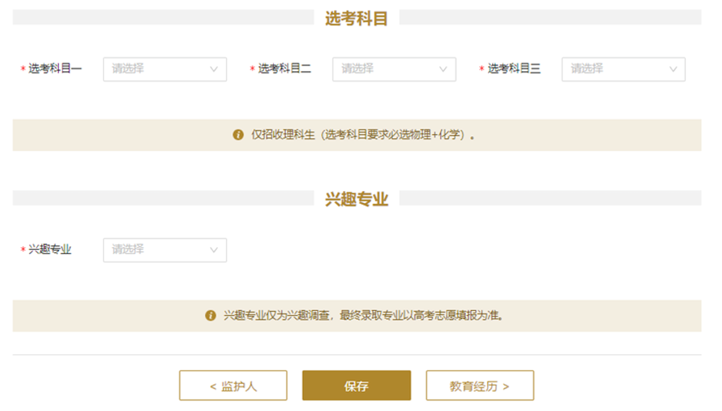 3.按照顺序填写【基本信息】、【监护人】、【选考科目】、【教育经历】、【高中学习成绩】、【竞赛获奖】、【荣誉称号】、【课外经历】和【资料上传】。在完成某一模块的填写后请及时点击“保存”按钮,系统会自动进行校验并通过提示框提示保存状态。