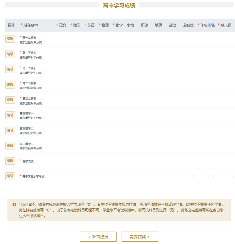 7.【高中学习成绩】模块中,高一上期末、高一下期末、高二上期末、高二下期末、高三上期末、高中学业水平考试成绩属于必填内容,高三模考一、高三模考二、高三模考三属于选填内容。复读考生需填写复读上期末、复读模考一的成绩和排名。语文、数学、英语、物理、化学为必填项,如没有成绩请在输入框內填写“0”。年级排名、年级人数为必填项,如学校不提供所有科目总排名,可填写语数英三科成绩排名。如学校无法提供任何排名,请在排名处填写“0”。上海考生须填写春考成绩,浙江考生须填写首考成绩。请务必完整填写所在省份学业水平考试科目成绩。