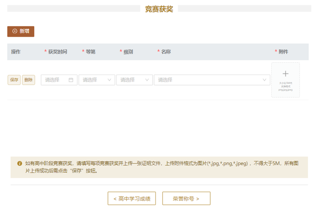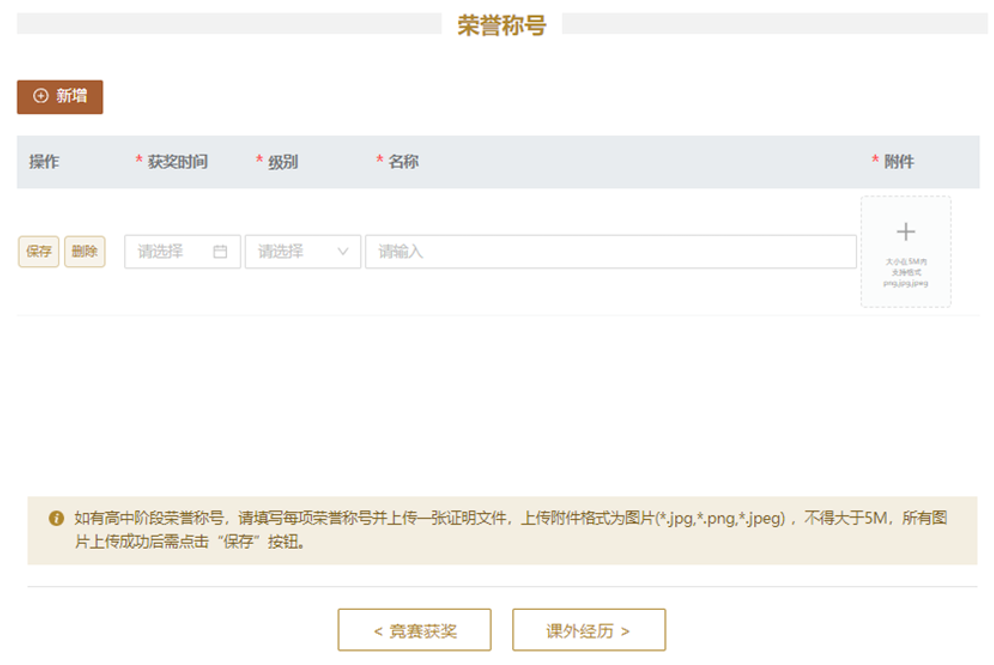 9.【荣誉称号】模块为选填项。该部分仅需填写高中阶段的荣誉称号,每项荣誉称号须上传一张证明文件,上传文件格式为图片(*.jpg,*.png,*.jpeg),不得大于5M,图片上传成功后需点击“保存”按钮。