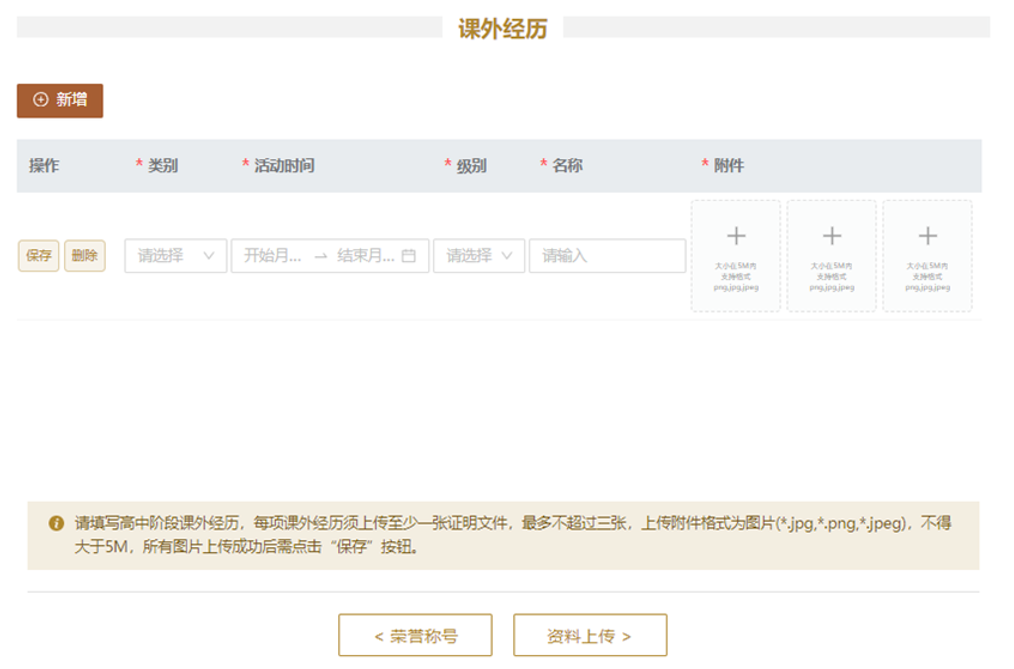 10.【课外经历】模块为选填项。该部分仅需填写高中阶段课外经历,每项课外经历须上传至少一张证明文件,最多不超过三张,上传文件格式为图片(*.jpg,*.png,*.jpeg),不得大于5M,图片上传成功后需点击“保存”按钮。