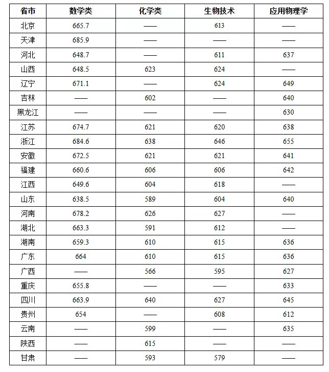 化学类、生物技术、应用物理学入围成绩=高考成绩(不含任何政策加分)